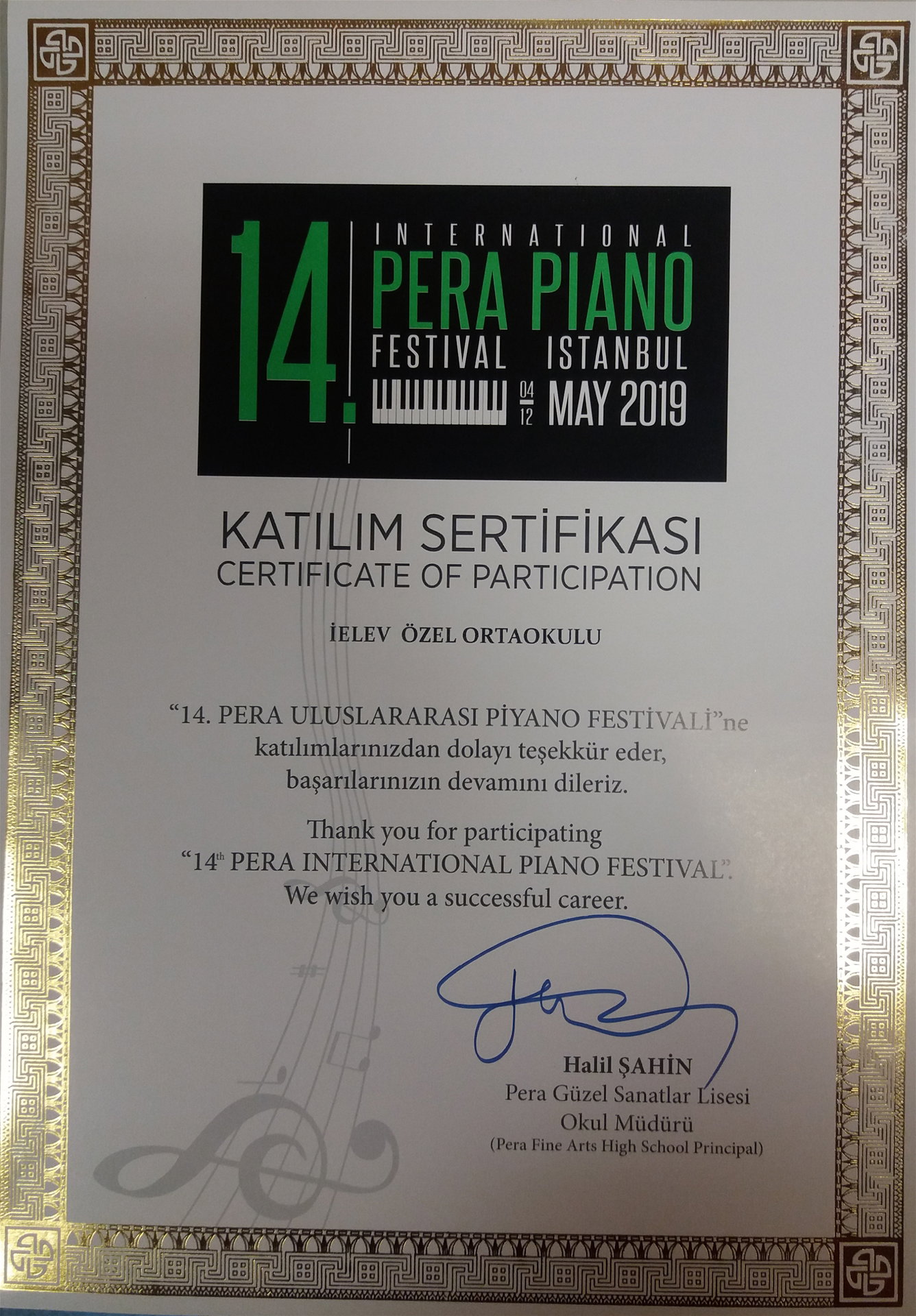 04-12 Mayıs 2019 tarihleri arasında düzenlenen 14.Uluslararası Pera Piyano Festivali’ne katılarak performanslarıyla göz dolduran öğrencilerimiz Tarık SİVRİKOZ (Ana Sınıfı), Ömer Tarık ERKAN (1-A), Ela Aden AKÇAY (1-A), Barış IRMAK (1-B), Defne ERCİYAS (1-C), Dilara ÖZDEMİR (2-B), Karaca Aslı BOR (2-B), Sinan Aras İŞERİ (2-B), Melek Leyla BELGİN (2-C), Kaçkar DEMİRDAĞ (2-C), Alisa ATAY (3-A), Günseli YÖRÜKER (3-A), Mert Emir UÇAR (3-A), Leyla Smyrna CABAS (3-B), Ayşe Naz ACET (3-B), Ayşe ÖZYILDIRIM (3-B), Ada DANYAL (3-C), Neslişah KOCATEPE (3-C), Zeren ÇALIŞKAN (3-C), Nida İÇEN (4-A), Arda BOZACIYAN (4-B), Lia DARÇİN (4-B),Efe EREN (4-C), Efe ALİKAYA (4-C), Cemre YALÇIN (4-C), Deniz SİNEMİLLİOĞLU (5-B), Can EKMEKÇİ (5-C), Haki Gün İÇEN (5-C), Lütfü Ata UYSAL (5-C), Işık TANKUT (5-C),Ömer Faruk ÖZDEMİR’e (7-A) festival komitesi tarafından sertifikaları verildi.