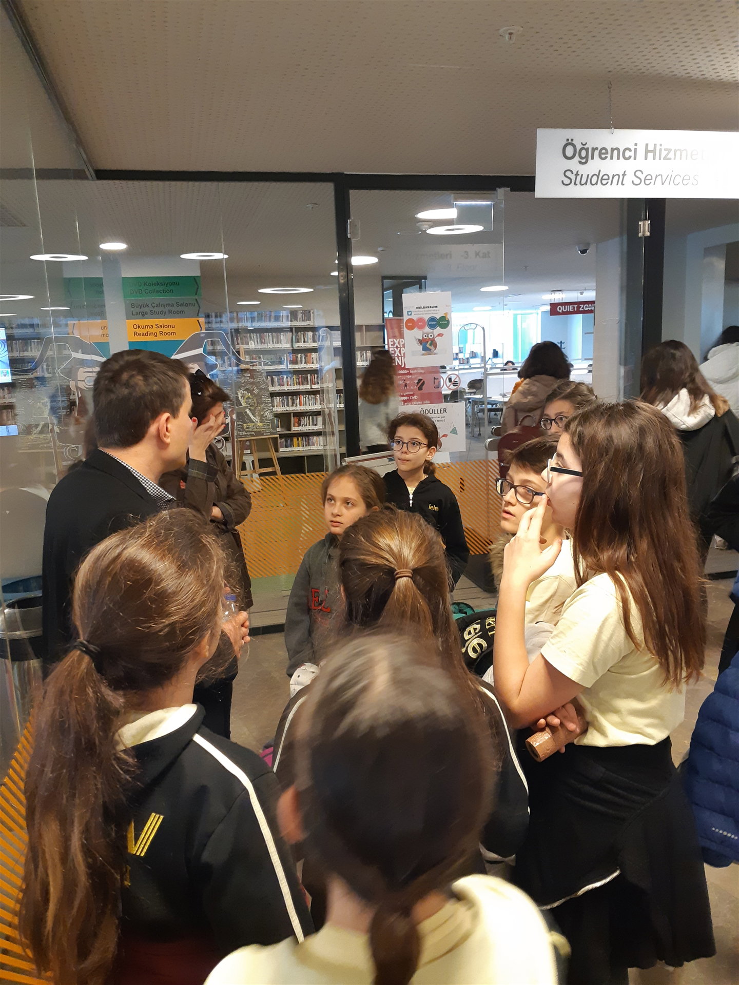 Öğrencilerimiz, kütüphane sorumlusunun rehberliğinde üniversitenin kütüphanesini gezerek geziye başladılar ve kütüphanede gezdikleri süre boyunca kitapların renkli dünyasında bulunmanın keyfini vardılar.