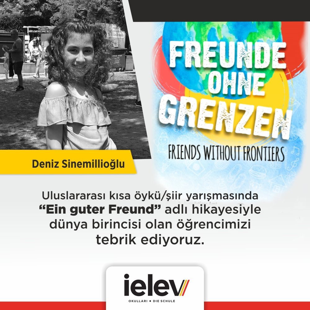 Alman Dışişleri Bakanlığı, Aufbau Yayınevi, Tagesspiegel gazetesi ve Thalia Kitapçılık tarafından ‘‘Freunde ohne Grenzen/Friends without Frontiers” (Sınır Tanımayan Arkadaşlık) başlığı altında 01 Temmuz 2019’da gerçekleşen uluslararası Almanca/İngilizce şiir ve kısa öykü yarışmasının duyurusu 5,6 ve 7.sınıf öğrencilerimize geçtiğimiz öğretim yılı yapılmıştı. Bir yıl önce Almanca öğrenmeye başlayan öğrencimiz Deniz SİNEMİLLİOĞLU Suriyeli bir çocuğun Türkiye’deki uyum sürecini konu aldığı “Ein guter Freund’’ adlı kısa hikâyesiyle yarışmaya katılarak 10 yaş kategorisinde dünya birincisi olmuştur. Ülkemizi ve okulumuzu başarıyla temsil eden öğrencimizi kutluyor, başarılarının devamını diliyoruz.