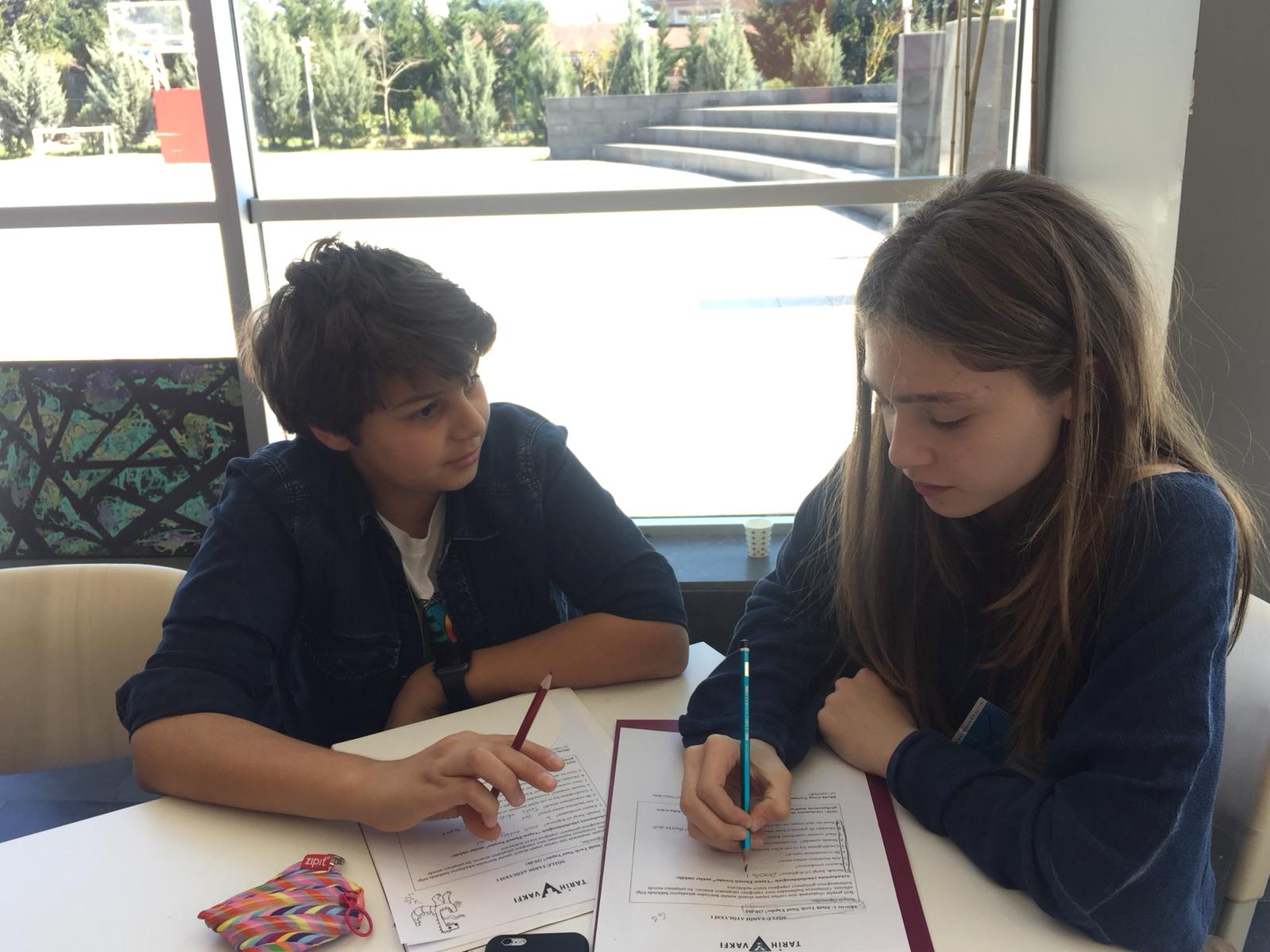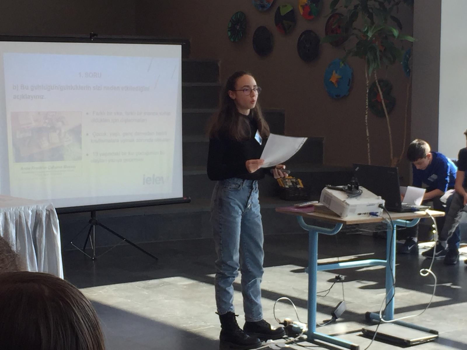 Okulumuzun “Tarih Takımı” nda yer alan öğrencilerimiz, birinci öğrenci atölyesinin ardından Anne Frank’ ın Hatıra Defteri’ nin 17 Haziran 1942 ile 17 Kasım 1942 tarihleri arasını inceleyerek kendilerine verilen soruları grup olarak yanıtladılar. Bu çalışmalarından elde ettikleri verilerle, ikinci öğrenci atölyesinde proje katılımcılarıyla paylaştıkları bir sunum gerçekleştirdiler. Atölye çalışmasının devamında Yrd. Doç. Dr. Özlem Çaykent’ in sözlü tarihin tarihsel gelişimi hakkında bilgi verdiği sunumun ardından öğrencilerimiz “Sözlü Tarih” atölyesine katıldılar. Proje finali hazırlıkları hakkında bilgi alan öğrencilerimiz planlamalarını yaparak “Göç” teması üzerinden çalışacakları konuyu belirlediler.