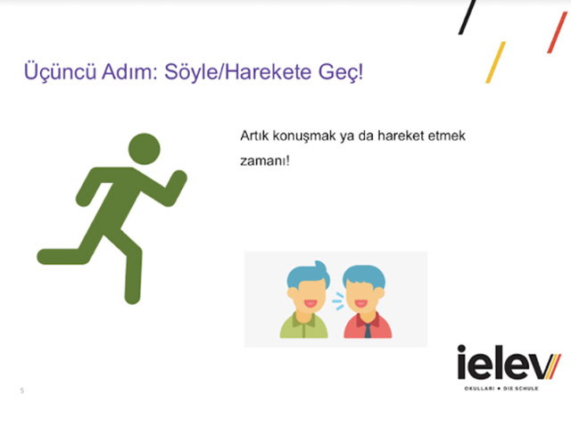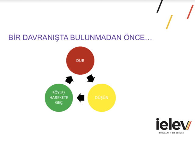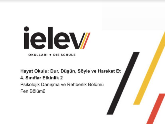 12-16 Kasım 2020 tarihleri arasında ana sınıfı, 1, 2, 3 ve 4. sınıf öğrencilerimize PDR ve Fen Bölümleri tarafından tasarlanan “Hayat Okulu” programı kapsamında, "Dur, Düşün, Söyle ve Hareket Et" etkinliğinin sunum bölümü rehberlik derslerinde yapılmıştır. Bu etkinliklerdeki amacımız, davranışların dürtüsel olmasının getirdiği genelgeçer görgü kurallarına dair eksiklikleri gidermektir. Yapılan sunumda bu adımların neler olduğu hatırlatılarak bu döngüyü tekrar etmenin neden önemli olduğu örnek bir olay ve videoyla açıklandı. Oyunun kurgusuyla “Dur, Düşün, Söyle, Hareket Et” teması adımlarının birbiriyle ilişkisi üzerinde duruldu.