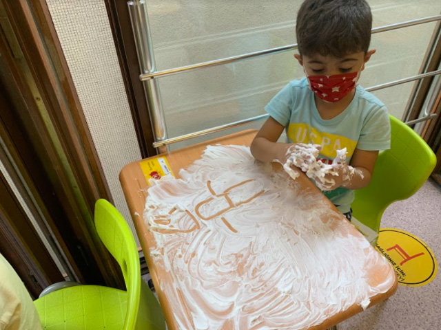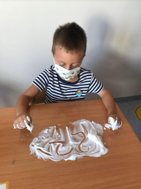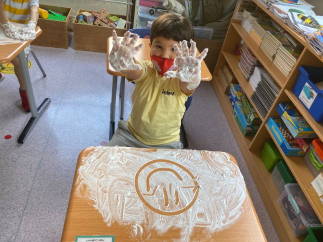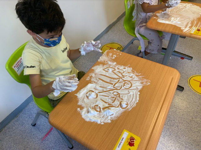 İELEV Özel İlkokulu / Ana Sınıfı 4-5 yaş öğrencilerimizle okuma yazmaya hazırlık çalışmaları kapsamında ince motor becerilerimizi desteklemek için traş köpükleri ile parmak egzersizleri yaptık. Öğrendiğimiz şekilleri, sayıları köpüklerin üzerine çizerek hem eğlendik hem de küçük kas gelişimimizi destekledik.