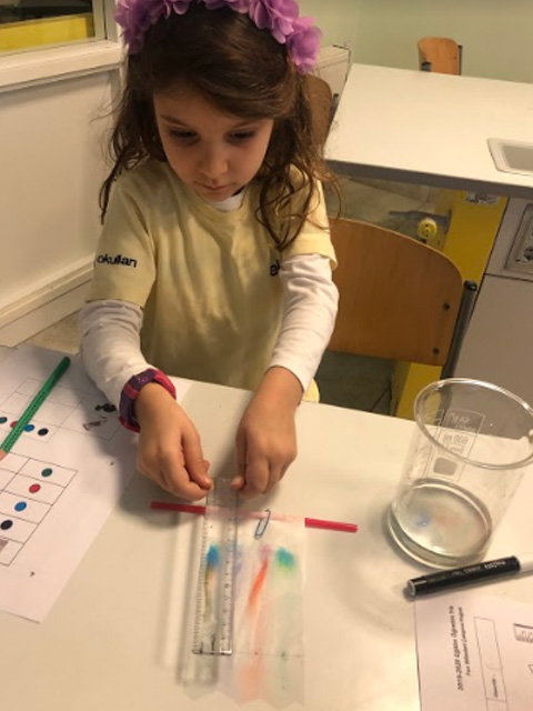 İELEV Özel 125. Yıl Anaokulu öğrencileri 21.02.2020 Cuma günü, fen öğretmenleri eşliğinde yaptıkları laboratuvar çalışmalarında, renklerin ayrılmasını sağlayan kromatografi deneyi ile renklerin içinde saklı olan diğer renklerin sırayla nasıl açığa çıkarılacağını keşfettiler. Her öğrenci kendine verilen malzemeler ile deney basamaklarını takip ederek bir bilim insanı hassasiyeti ile çalıştı. Bilimsel süreç becerileri olan gözlem yapma, ölçme, sınıflandırma gibi becerilerin öğrencilere kazandırılması amaçlanan etkinliğe öğrenciler severek katılarak kendi kendilerine keşfetmenin mutluluğunu yaşamışlardır.